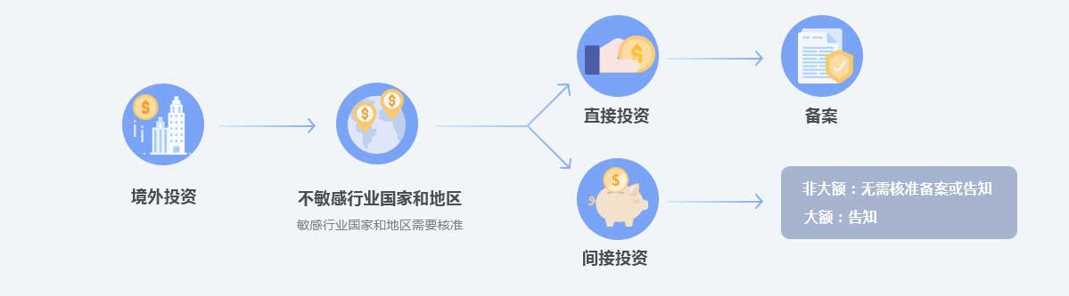 投资涉及非敏感行业且非敏感国家和地区的, 如果是间接非大额投资,无需核准备案或告知,如 果是间接大额投资,需要告知主管部门